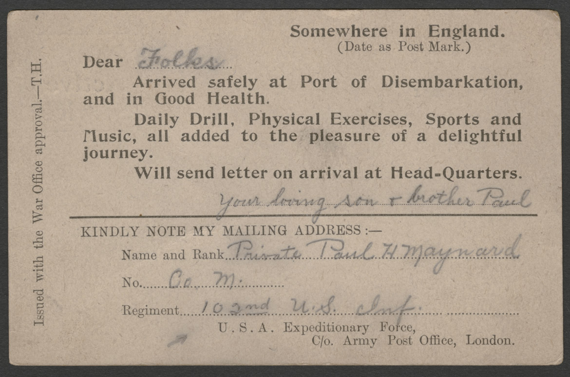 - Pvt. Paul Maynard, arrival postcard